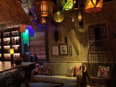 With 14 foot ceilings there was plenty of room for lamps and lighting. I suspended four repurposed teak ship’s hold covers from the ceiling to attach lamps and glass fishnet floats that are illuminated. In addition to several lamps I made, there are several made at Oceanic Arts. Several of my favorites were made by my friend, Typhoon Tommy Allsmiller. One wall is dedicated to my rare rums, all displayed on lighted shelves with wire mesh inset into sliding doors. All of this is hidden behind a pair of mahogany French doors overlooking the Oasis.